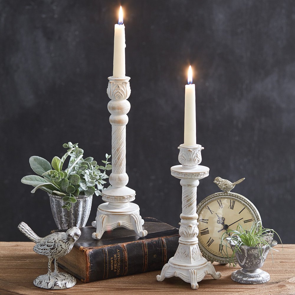 Dressed in sophistication, our Balmoral Taper Candle Holders effortlessly blend rustic charm with contemporary elegance. The whitewashed resin finish mimics the softness of weathered wood, adding a touch of vintage allure to any setting. The smallest taper candle holder measures 4¾'' dia. x 9¾''H.